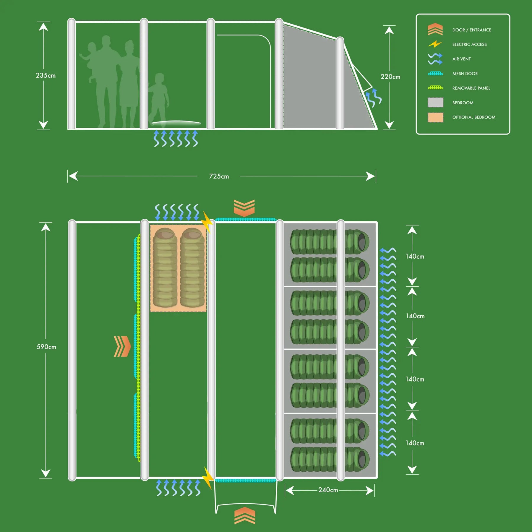 Zipped Privacy Curtains – Adjustable opening levels throughout the tent to control light and privacy.