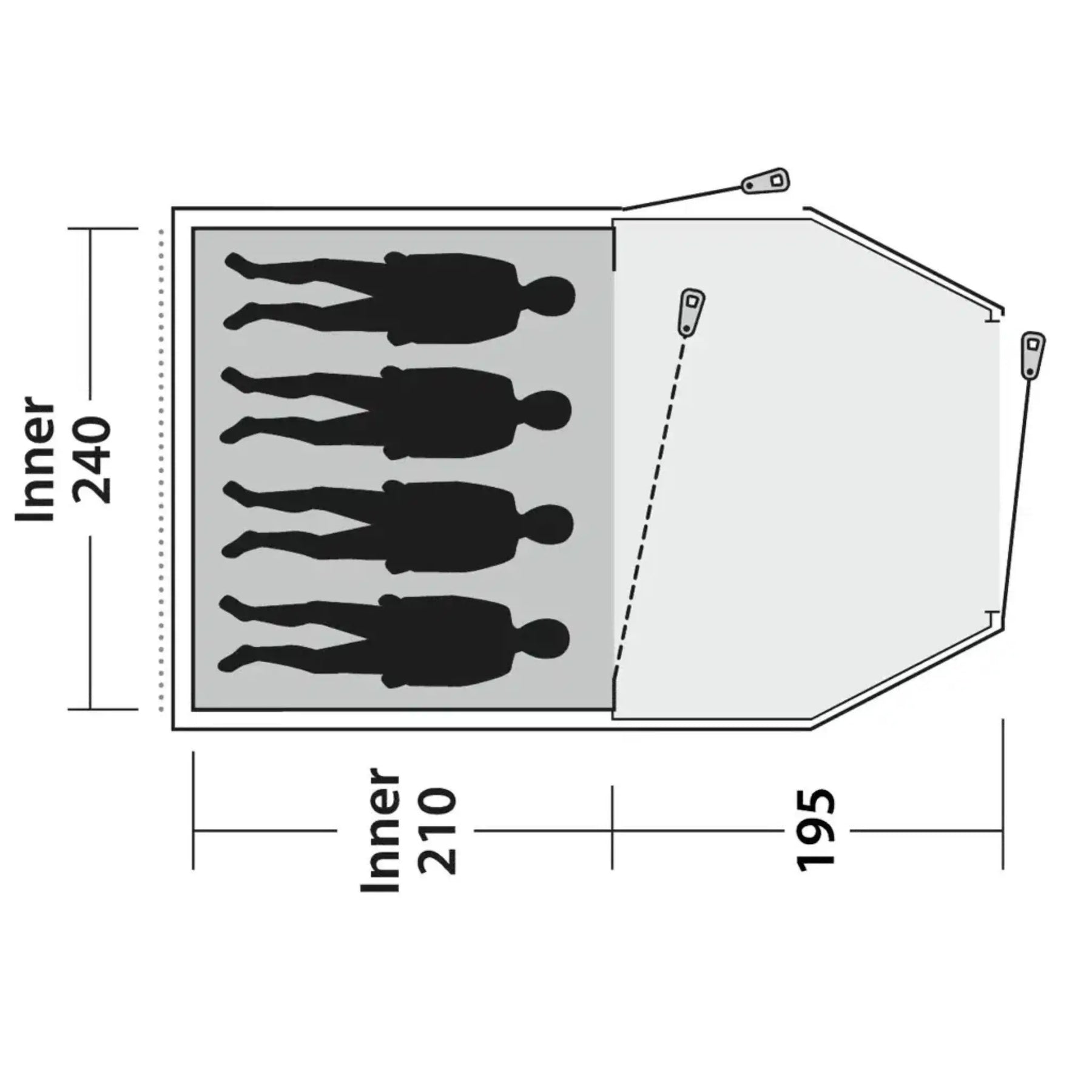 The Earth 4 Plus offers a generous living space for a tent of its pack size. The front storage/living area includes a bathtub groundsheet sewn to the inner tent, reducing draughts and helping prevent water ingress. This porch groundsheet can be folded under when not required, ideal for muddy or wet conditions. Two doors (front and side) give flexible access and help improve airflow. The living area is bright, airy and practical for families needing space for bags, shoes, or indoor relaxation on rainy days.