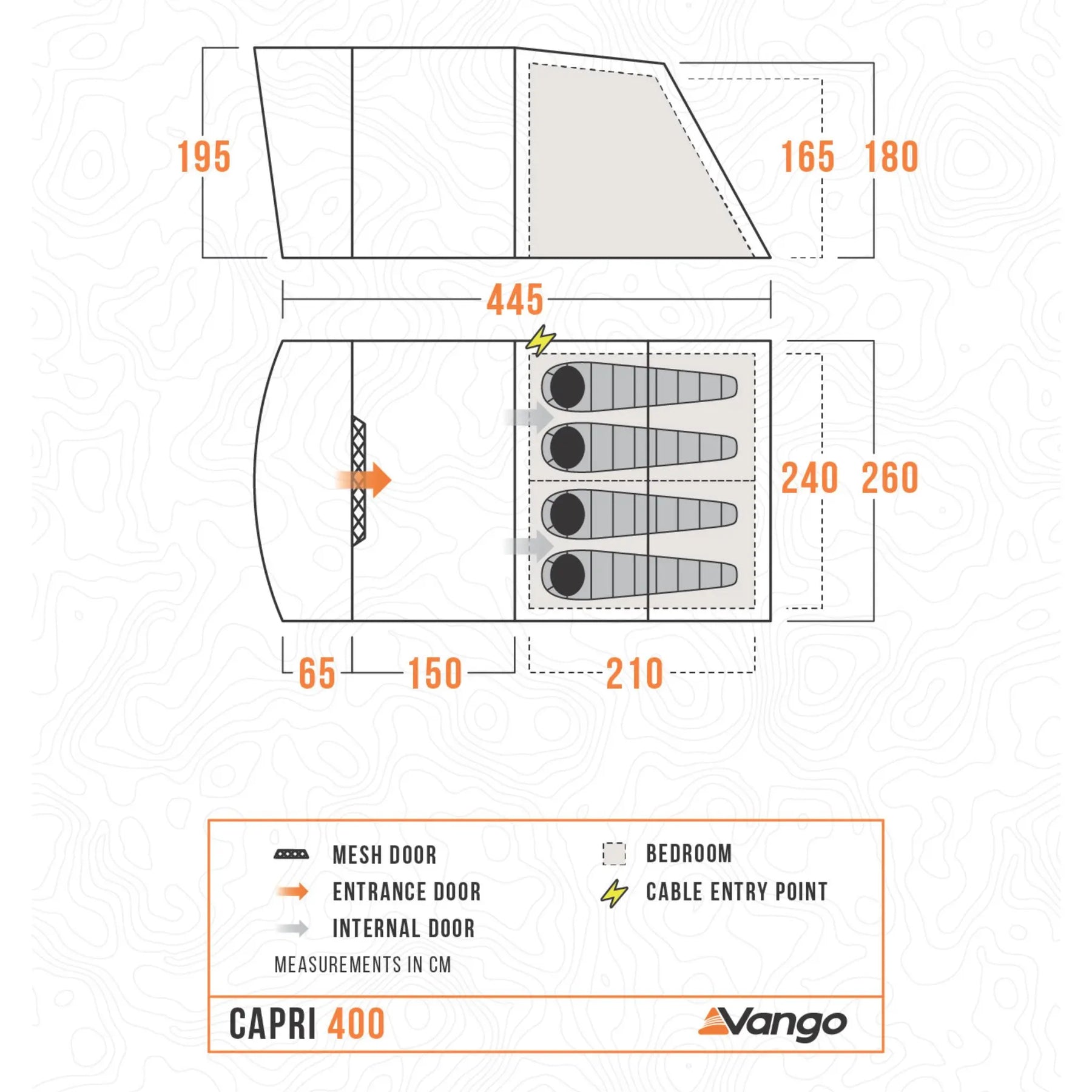 Designed with comfort in mind, the Vango Capri 400 Tent features generous queen-size bedrooms that promote restful sleep and flexible family layouts.