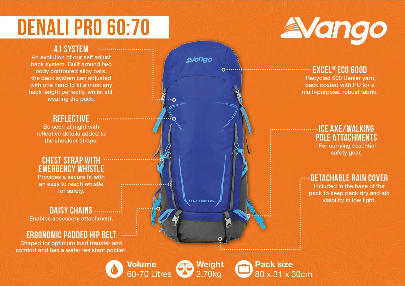 Features of the Vango Denali Pro 60:70 Rucksack